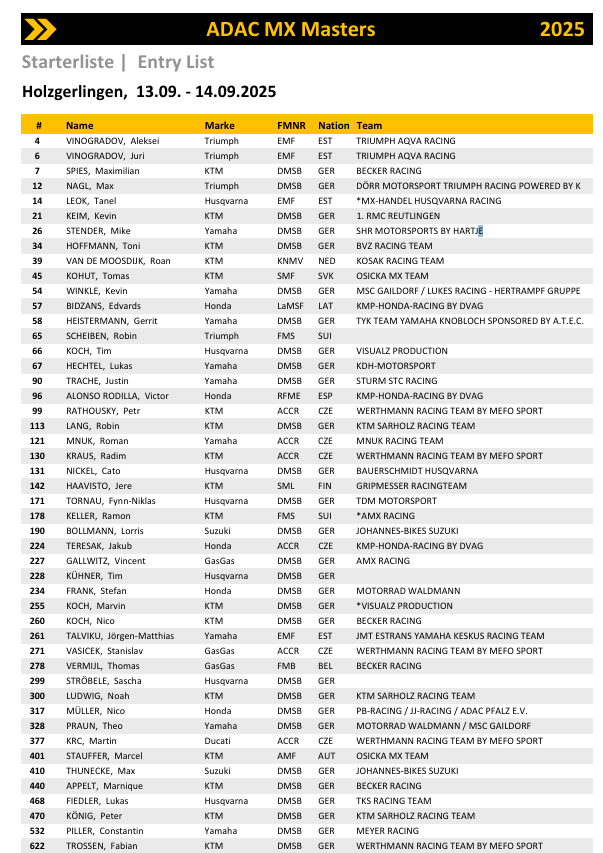 In de ADAC MX Masters klasse gaat Max Nagl aan de leiding. Tijdens de vorige ronde in Bitche nam hij de koppositie over van Roan van de Moosdijk, die slechts drie punten achterstand heeft. Dit maakt de strijd in Holzergerlingen extra spannend. Max Spies is een outsider voor de titel met 33 punten achterstand, terwijl de Belg Thomas Vermijl ook meedoet. Opvallend: van de zeven gereden rondes waren er telkens verschillende winnaars. Wie zal deze laatste ronde winnen?