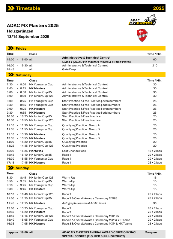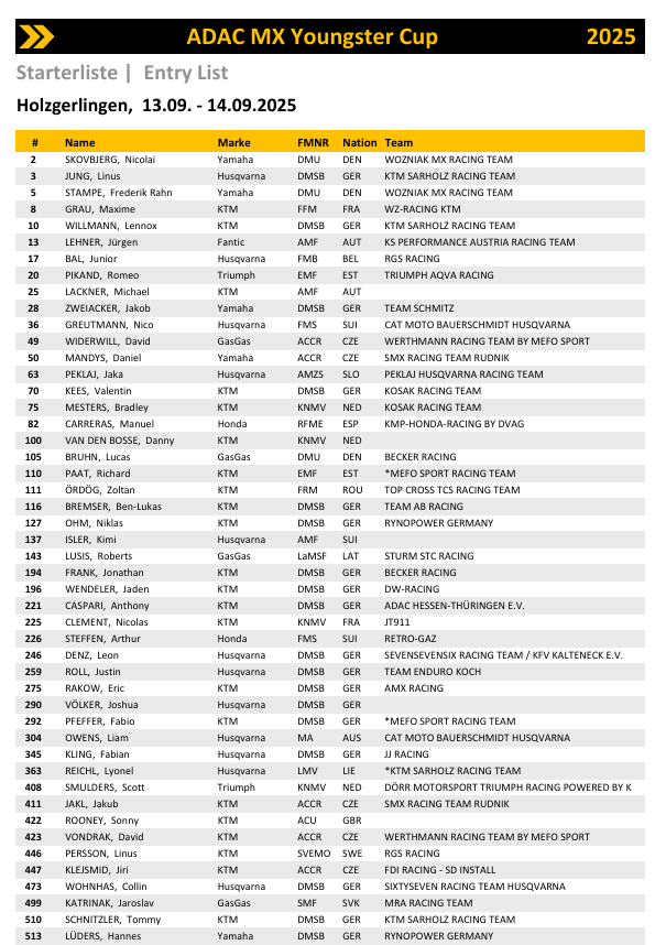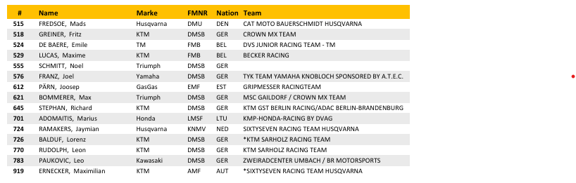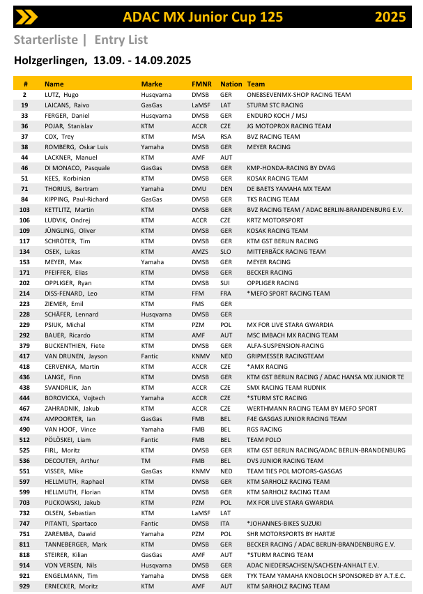 Bij de ADAC MX Junior Cup 125 gaat het kampioenschap dit weekend tussen de Belg Ian Ampoorter, leider met 21 punten voorsprong, en de Oostenrijker Moritz Ernecker. Nummer drie, Raivo Laicans, heeft een achterstand van 51 punten. Nederland is vertegenwoordigd door Jayson van Drunen en Mike Visser, terwijl de Belgen Vince van Hoof en Liam Pölöskei meedoen.
