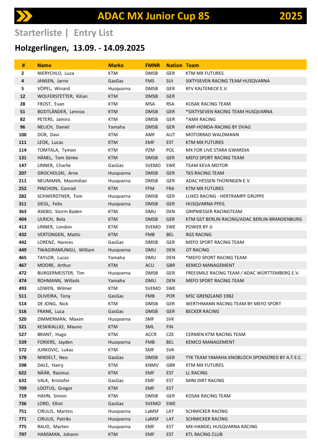 In de ADAC MX Junior Cup 85 heeft de Est Lucas Leok al de titel binnen. De strijd richt zich nu op de overige podiumplekken. Jarno Jansen bezet de tweede plek met 21 punten voorsprong op Harry Dale, terwijl Marten Raud slechts één punt achterstand heeft op Dale. Nederland is dit weekend niet vertegenwoordigd, maar de Belgen Jayden Foriers en Matto Vertongen staan aan de start.