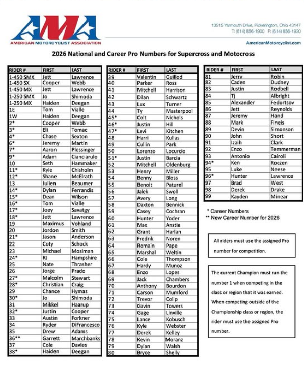 Met het 2026-seizoen in aantocht heeft de American Motorcyclist Association (AMA) de officiële startnummers bekendgemaakt voor de professionele rijders die zullen deelnemen aan het komende AMA Supercross- en AMA Pro Motocross-seizoen.