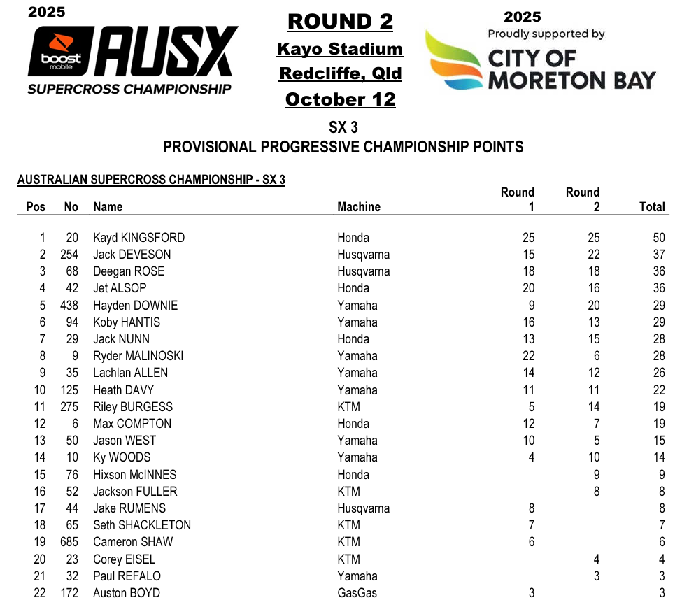 Kayd Kingsford (Honda) was opnieuw de snelste in de SX3-klasse en schreef zijn tweede overwinning op rij bij. Hij leidde van start tot finish en bleef Jack Deveson en Hayden Downie voor.