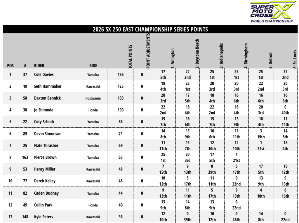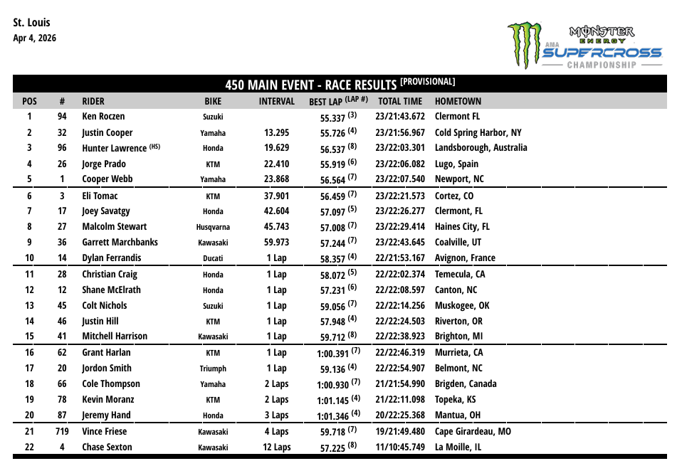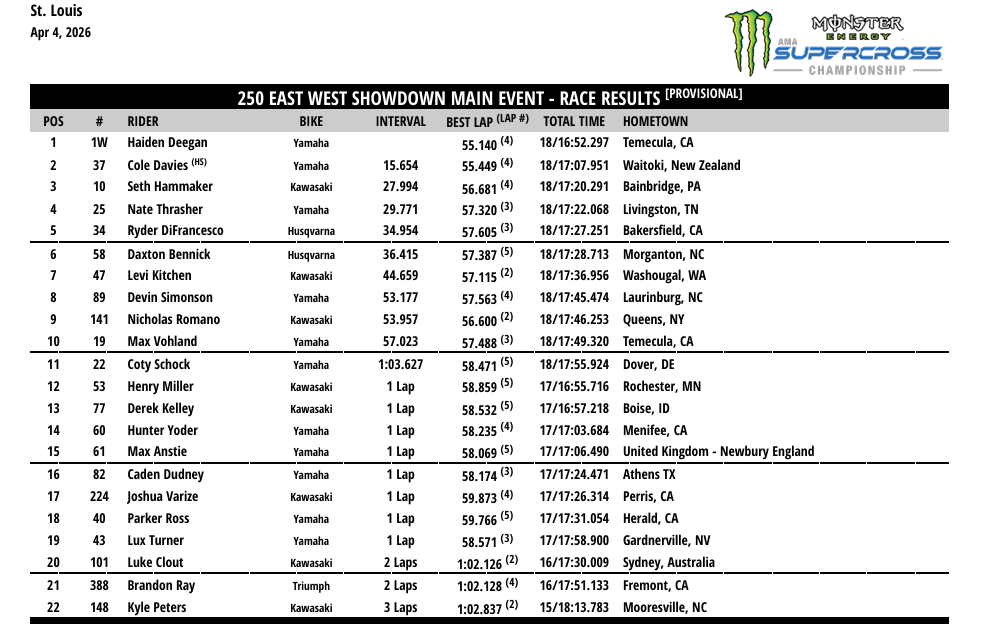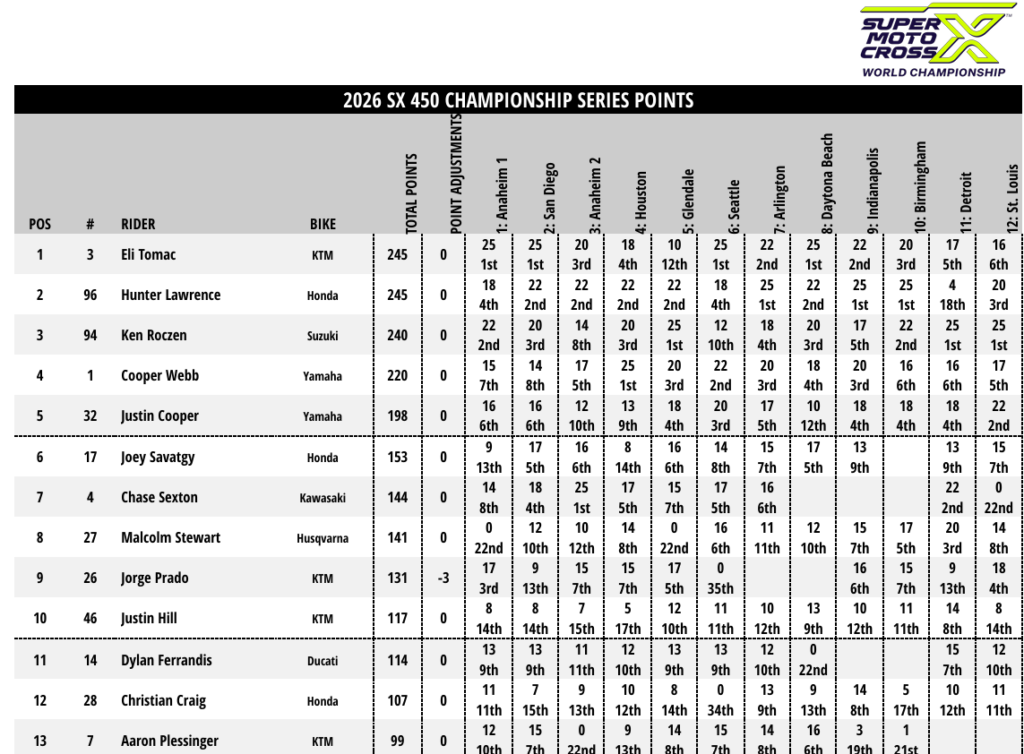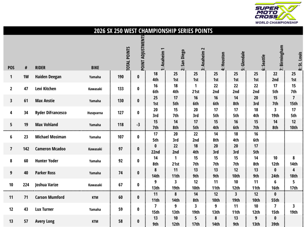 De twaalfde ronde van het AMA Supercross Championship in St. Louis heeft spektakel en belangrijke beslissingen opgeleverd. In het Dome at America’s Center wist Haiden Deegan zijn dominante seizoen te bekronen met de titel in de 250SX West Division, terwijl Ken Roczen de overwinning pakte in de 450SX-klasse.