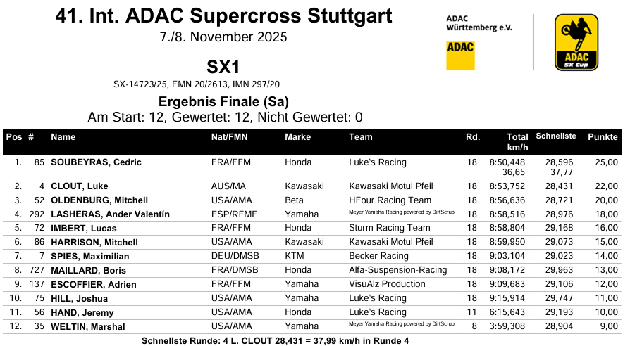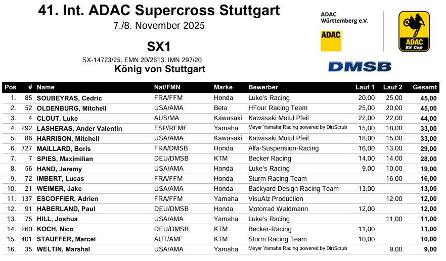 In de koningsklasse SX1 pakte Cédric Soubeyras zijn derde overwinning in Stuttgart, na eerdere zeges in 2017 en 2022. De 36-jarige Fransman maakte een indrukwekkende comeback na een zware heupblessure die hem vorig jaar lang aan de kant hield.