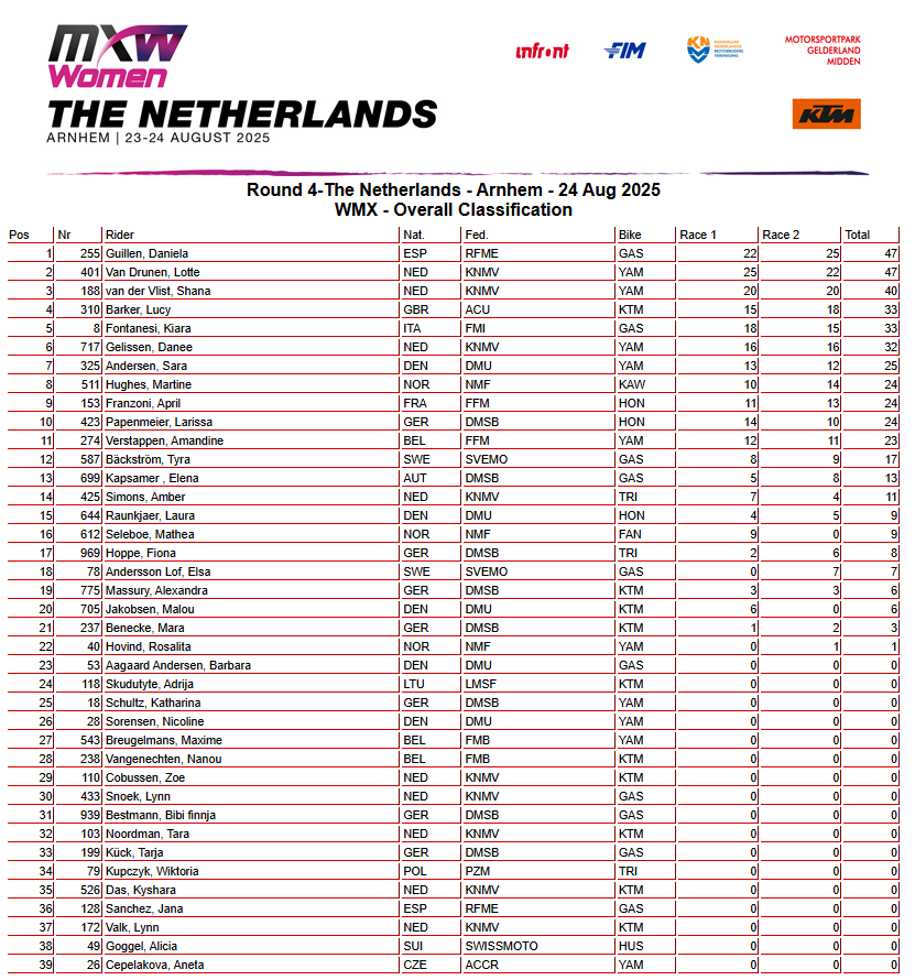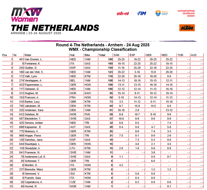Voor Van Drunen voelde het resultaat zuur: winst in de eerste manche en een heroïsche aanval in de tweede waren nét niet genoeg voor de thuisoverwinning die ze zo graag wilde. Toch leverde haar weekend veel op, want in de strijd om het wereldkampioenschap vergrootte ze haar voorsprong van zes naar twintig punten. Van der Vlist zorgde ondertussen voor extra Nederlandse trots door in beide manches als derde te eindigen en daarmee het podium compleet te maken.