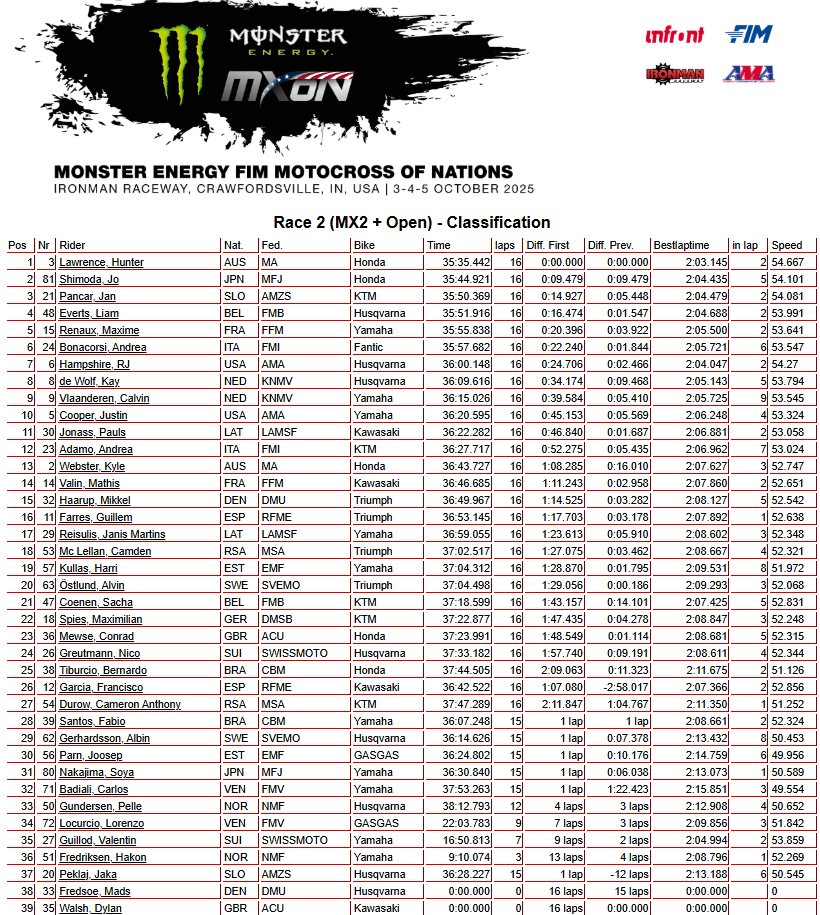 Tijdens de tweede heat van de Motocross of Nations in Ironman, waar de MX2- en Open-rijders in actie kwamen, wist Hunter Lawrence (AUS) opnieuw indruk te maken. De Australiër pakte de holeshot en reed vervolgens onbedreigd naar zijn tweede overwinning van het weekend. Achter hem waren er spannende duels, maar ook veel fouten. RJ Hampshire (USA) reed sterk naar voren, maar ging meerdere keren onderuit en zag daarmee een podiumkans in rook opgaan.