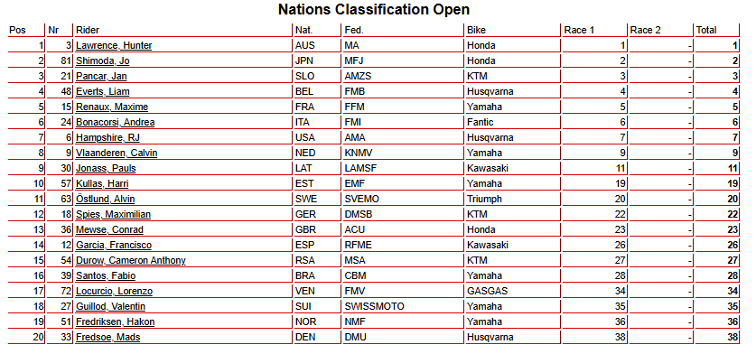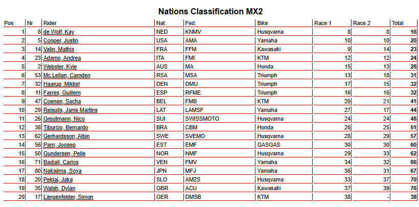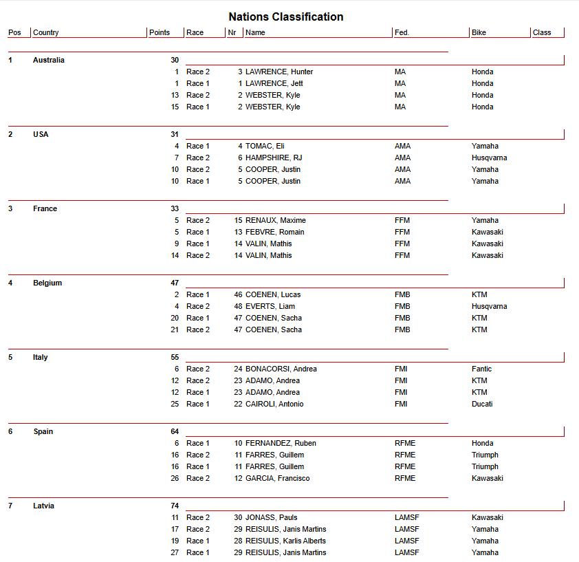 Na twee manches gaan Australië en Amerika met een gelijk aantal punten de laatste wedstrijd in. Bekijk hieronder de uitslagen van de tweede manche van de MXoN: