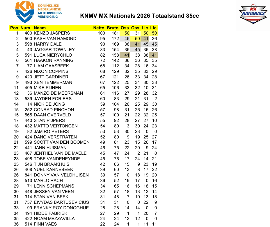 In de NK 85cc-klasse was het Kenzo Jaspers die met de winst ervandoor ging. Met een overtuigende dubbele manchezege pakte hij de dagoverwinning. Harry Dale werd met twee tweede plaatsen tweede overall (2-2), terwijl Luca Nierychlo het podium compleet maakte. Door zijn sterke optreden neemt Jaspers de leiding in de tussenstand over van Kash van Hamond, die in Lichtenvoorde vierde werd. Het verschil bedraagt nu vijf punten.