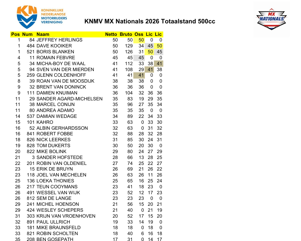In de NK 500cc-klasse wist Dave Kooiker de dagzege te pakken met een 2-1 in de manches. Boris Blanken werd tweede (1-2), terwijl Micha-Boy de Waal (4-3) als derde op het podium eindigde. In deze klasse delen Jeffrey Herlings, Kooiker en Blanken momenteel de leiding in het kampioenschap.