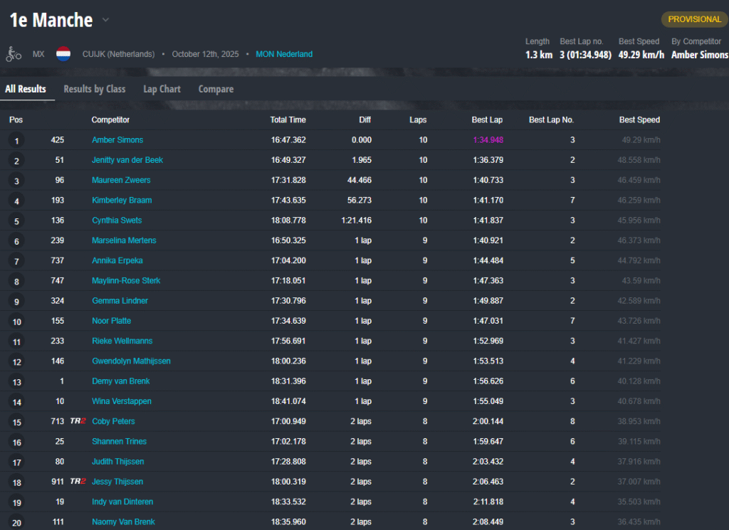 Aan de finish was het Amber Simons die de manche won, met Jenitty van der Beek kort daarachter. Samen hadden ze maar liefst 45 seconden voorsprong op Maureen Zweers, die als derde over de streep kwam. Braam en Swets maakten de top vijf compleet. Met deze tweede plaats was het kampioenschap officieel beslist: Jenitty van der Beek is de nieuwe Nederlands Kampioen MON Dames 2025!