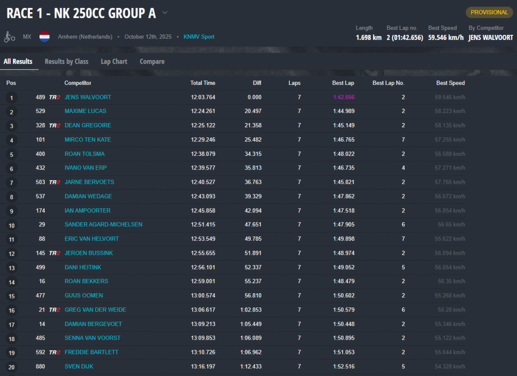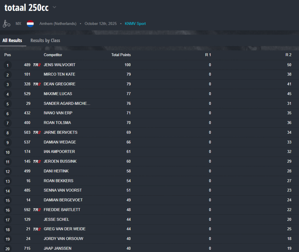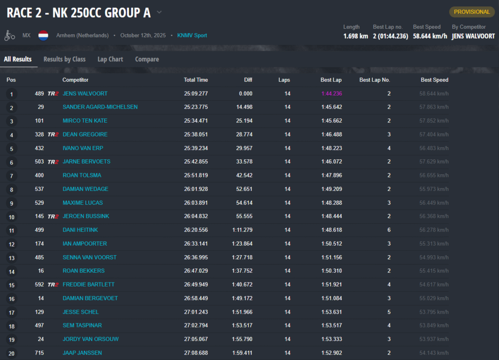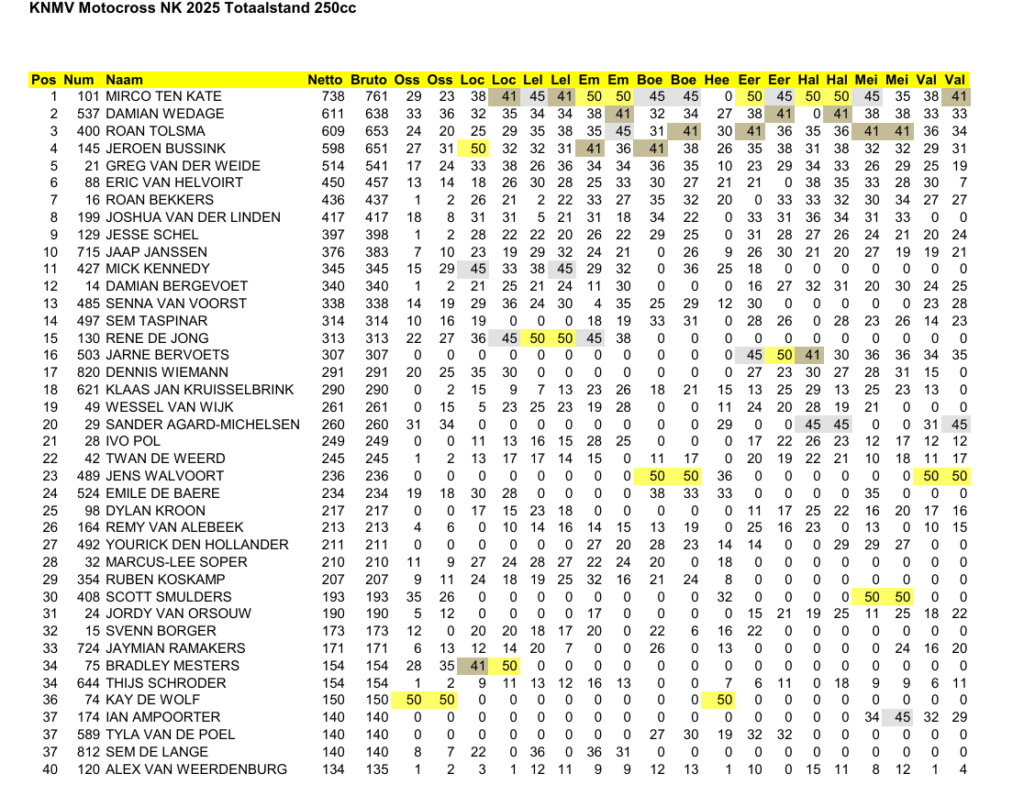Met deze finale is het NK 250cc seizoen op spectaculaire wijze afgesloten, waarbij Walvoort liet zien uitermate competitief te zijn en Ten Kate zijn titelstatus nogmaals bevestigde. Bekijk hieronder de uitslagen van de laatste wedstrijd in Valkenswaard: