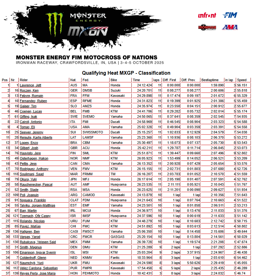 Tijdens de MXGP-kwalificatieheat van de Motocross of Nations in Ironman, Amerika, was het Jett Lawrence die de toon zette. De Australiër pakte de holeshot en reed vanaf het begin onbedreigd naar de overwinning. Achter hem volgde Ken Roczen (Duitsland), die een sterke race reed en als tweede over de finish kwam, terwijl Romain Febvre (Frankrijk) de top drie completeerde.