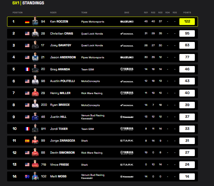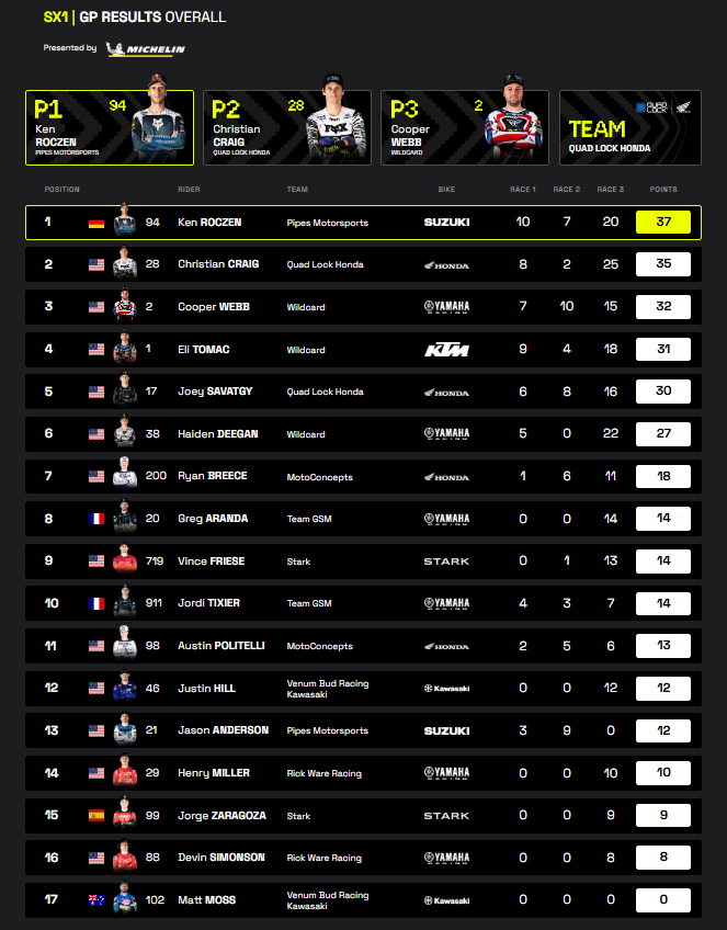 Roczen pakte de winst in de eerste sprint, werd vierde in race twee en verzekerde zich met een derde plaats in de main event van de overall zege. Zijn constante optreden bleek opnieuw zijn grootste wapen. “Ik ben super tevreden met mijn rijden. Ik voel me een completere rijder dan ooit,” vertelde hij na afloop.