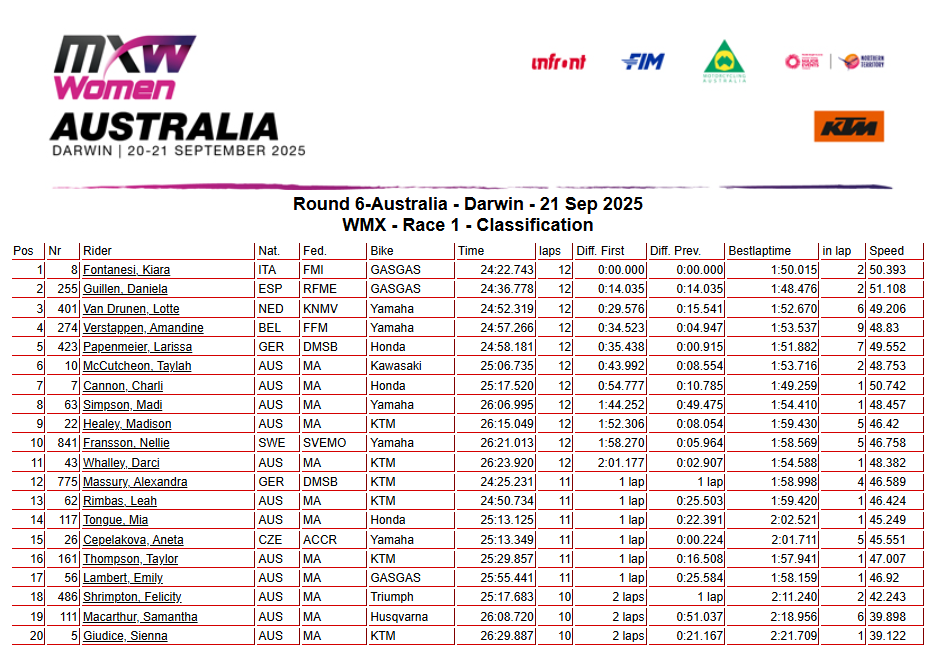 De eerste manche van de WMX Grand Prix van Australië werd verreden onder de brandende zon in Darwin. Met acht vaste deelneemsters uit het WK en twaalf Australische wildcardrijdsters stond er een interessant startveld aan de poort.