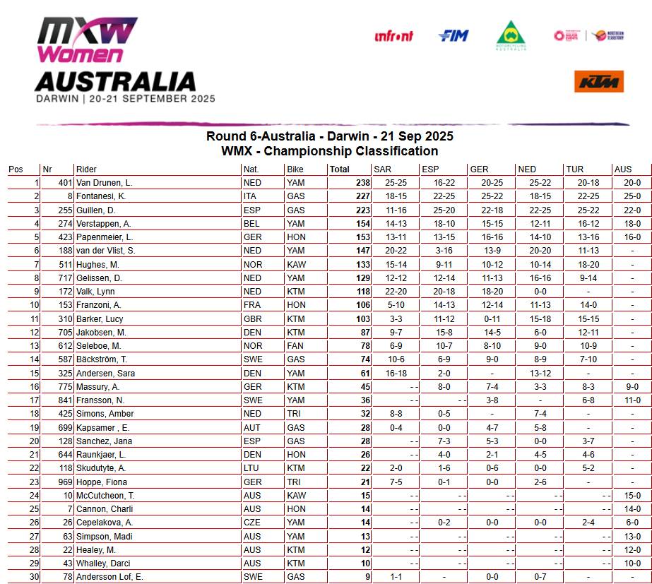 Achter haar leek Daniela Guillen de grootste uitdager, maar na een botsing met de motor van Charli Cannon ging de Spaanse onderuit. Ze hervatte haar race sterk en wist alsnog tweede te worden. Lotte van Drunen werd derde, ze verdedigde hiermee haar leiding in het kampioenschap. Met elf punten voorsprong gaat ze morgen de tweede manche in en probeert ze haar wereldtitel de prolongeren.