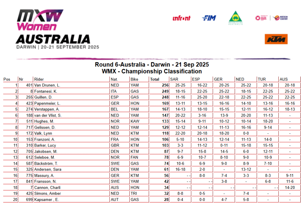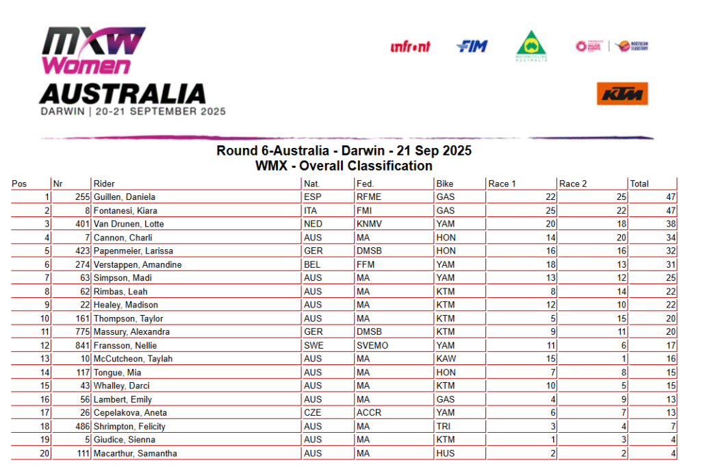 Bekijk hieronder de WMX-uitslagen van de MXGP van Australië: