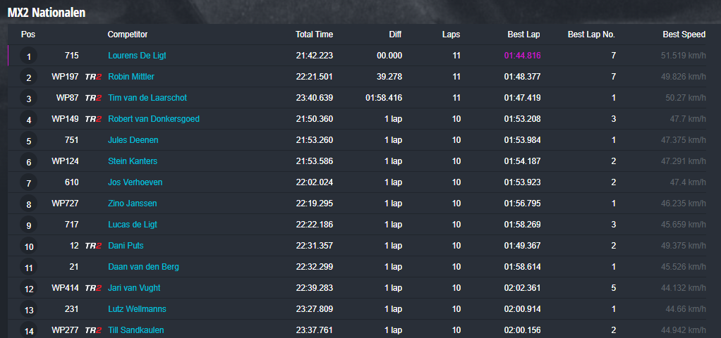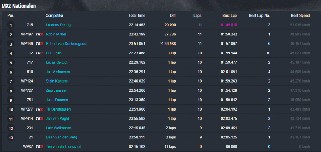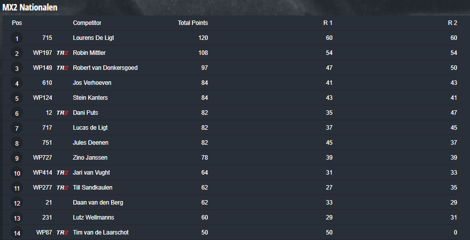 Een seizoen om trots op te zijn, Lourens de Ligt heeft met zijn snelheid, constante prestaties en vechtlust laten zien de terechte MX2 Nationalen-kampioen te zijn. Bekijk hieronder de uitslagen van de wedstrijd in Meijel: