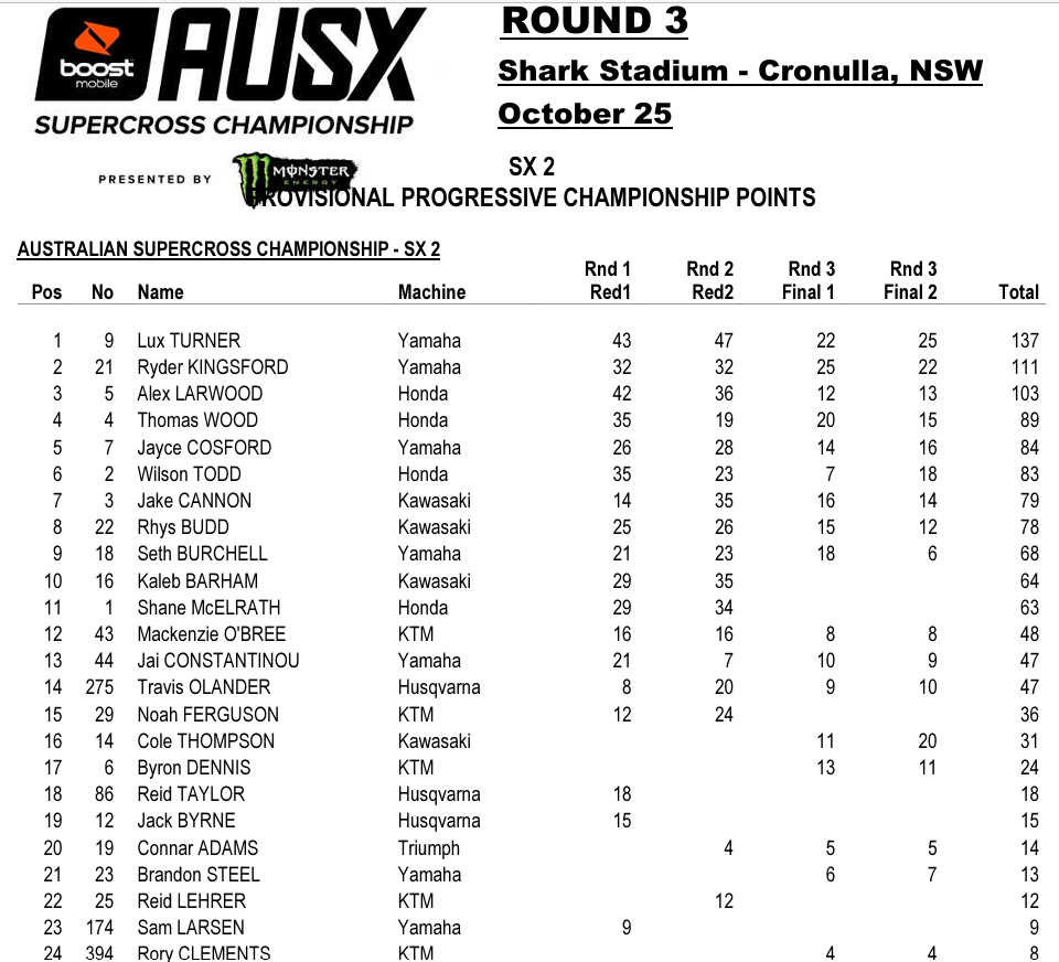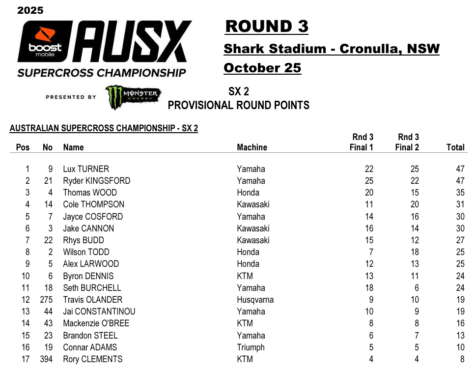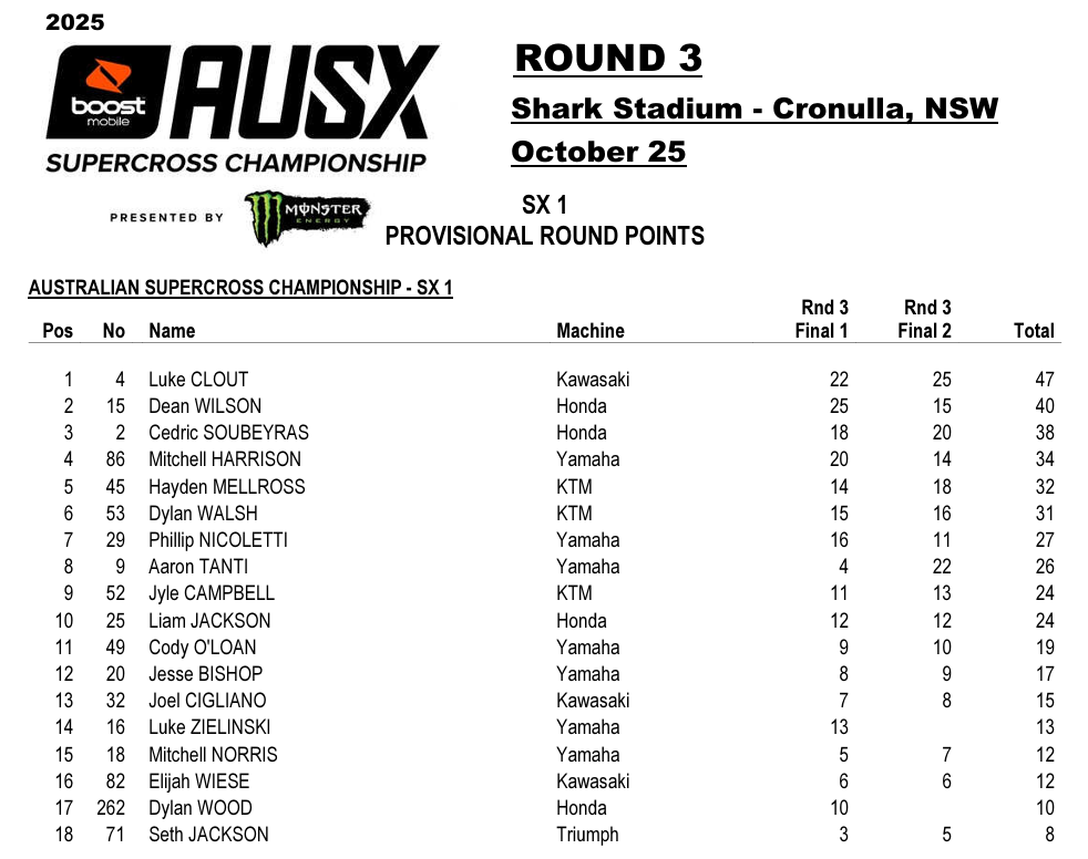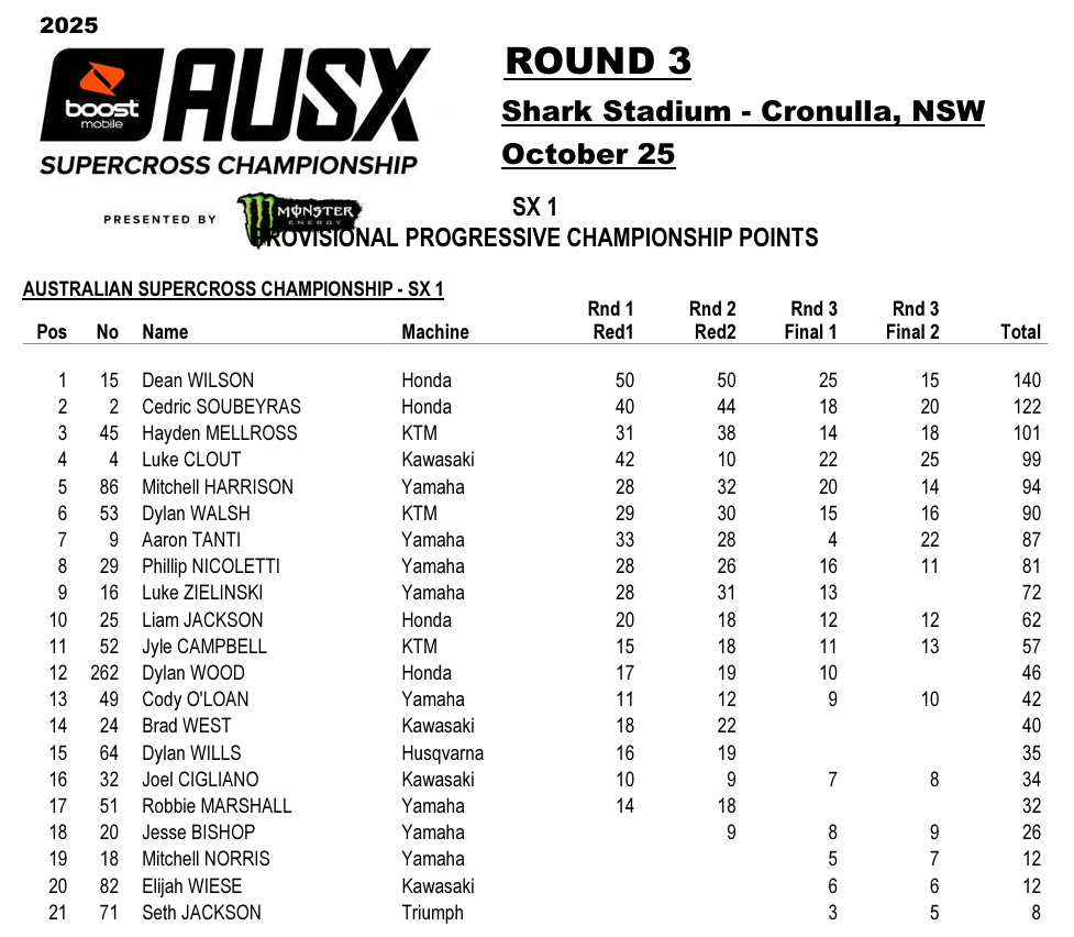De derde ronde van het Australisch Supercross Kampioenschap (AUSX) in Sydney zorgde voor volop spektakel. In de SX1-klasse was Dean Wilson onverslaanbaar met twee manchezeges. In de tweede manche kreeg Wilson een straf van vijf plaatsen wegens springen onder gele vlag. Na een protest kreeg Wilson gelijk en pakt hij alsnog de dagzege. Luke Clout (2-2) werd tweede voor Cedric Soubeyras (4-4). Mitchell Harrison en Hayden Mellross completeerden de top 5. In het kampioenschap versterkt Wilson zijn leidende positie en staat 30 punten voor op Soubeyras, terwijl Mellross derde staat.