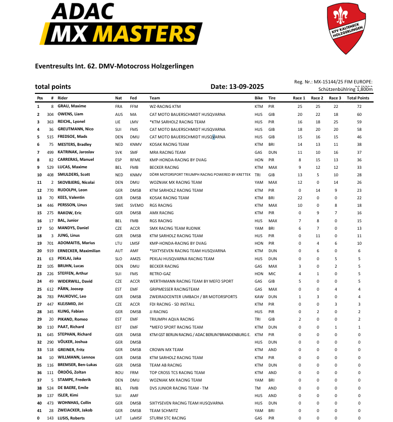 De finale van de ADAC MX Youngster Cup in Holzgerlingen leverde spannende races op in zware omstandigheden. Terwijl Maxime Grau met twee overwinningen zijn snelheid onderstreepte, ging de titel naar Mads Fredsoe, die daarmee zijn tweede ADAC-titel op rij veiligstelde na eerder de ADAC MX Junior Cup 125 te hebben gewonnen in 2023.