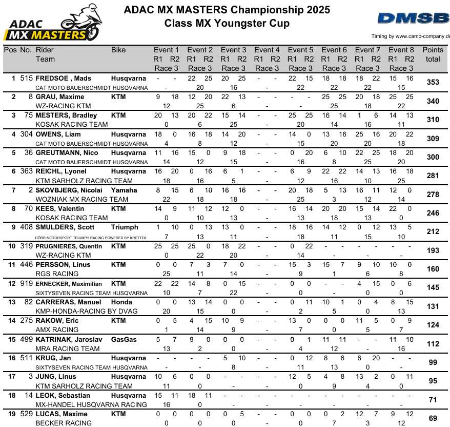 Hoewel Grau de dagwinnaar werd, was de grootste prijs voor Mads Fredsoe. De Deen eindigde dit seizoen als kampioen van de ADAC MX Youngster Cup, nadat hij in 2023 al de titel in de ADAC MX Junior Cup 125 had veroverd. Grau sloot het kampioenschap als tweede af en Bradley Mesters pakte een mooie derde plaats in de eindstand. Scott Smulders eindigde op een keurige negende plaats in het klassement.