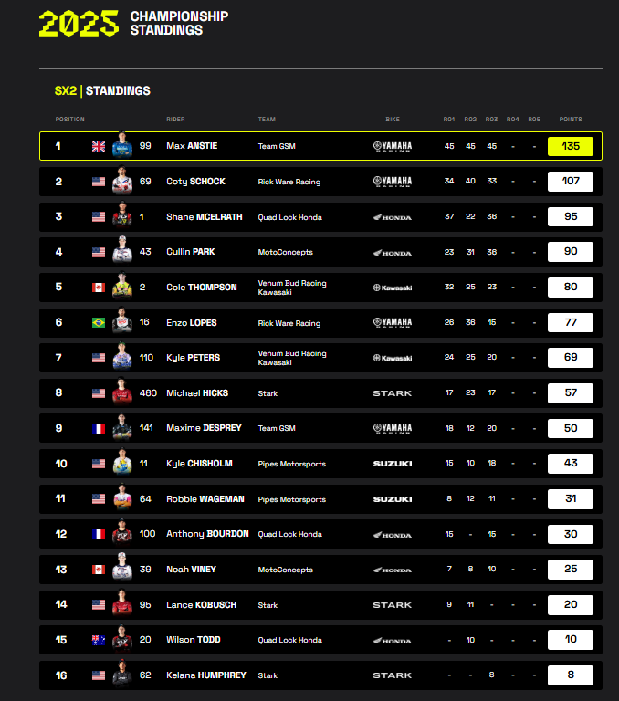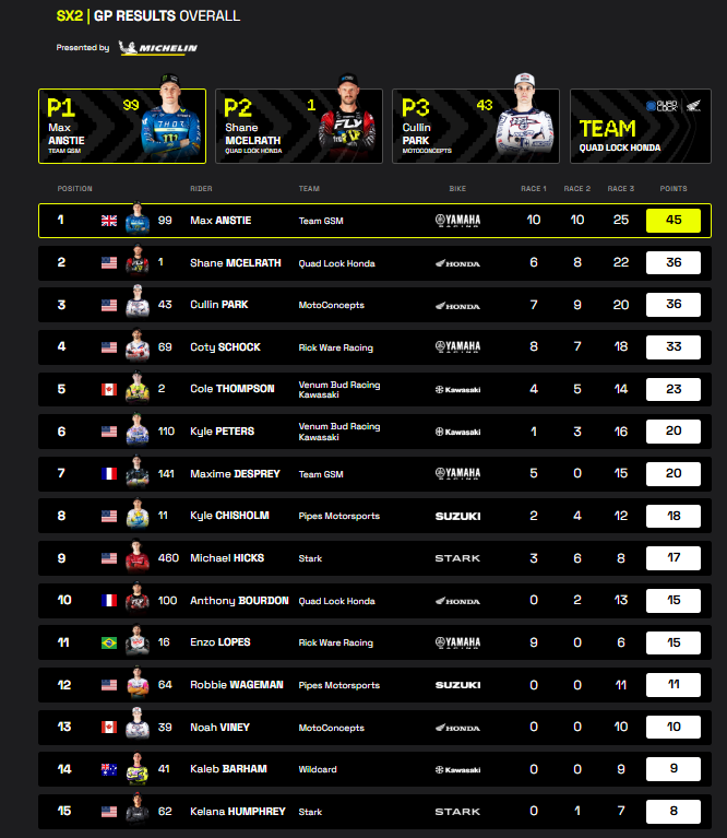 Max Anstie toont opnieuw zijn absolute dominantie in het SX2-kampioenschap van de World Supercross. Op de Gold Coast won de Brit alle drie de mains, waarmee hij zijn perfecte reeks voortzet na Buenos Aires en Vancouver.