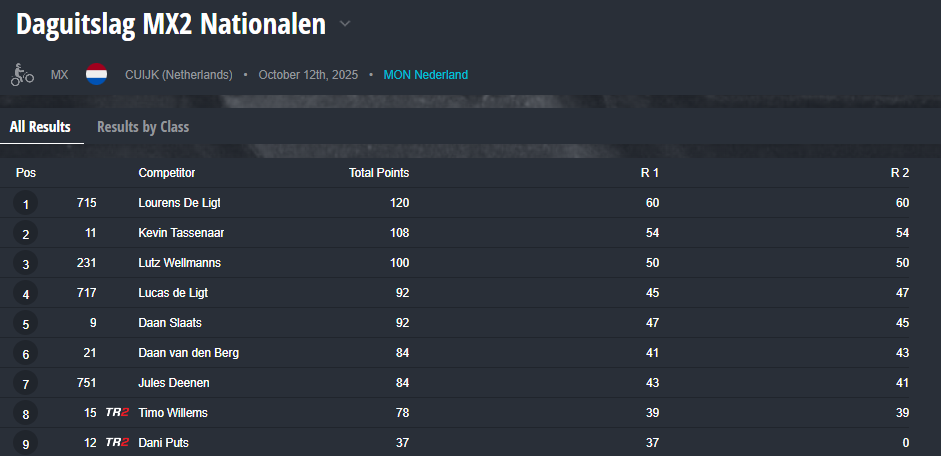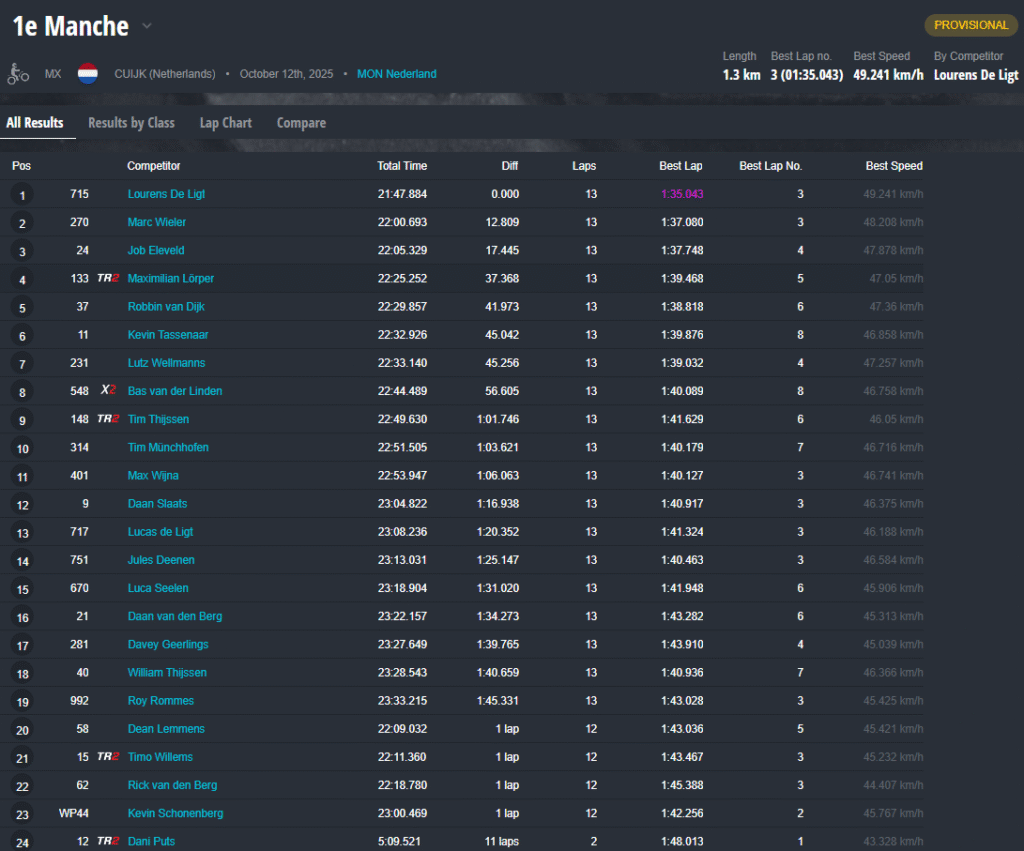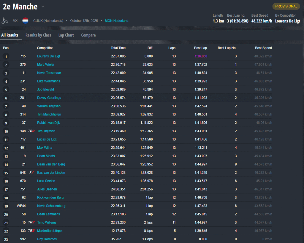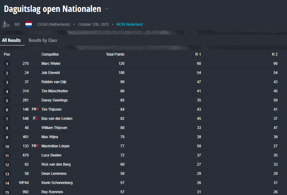 Lourens de Ligt reed uiteindelijk onbedreigd naar de winst, gevolgd door Wieler en Eleveld. Lörper eindigde als vierde en was daarmee derde in de MX Open Nationalen, voor Robbin van Dijk op plaats vijf. Op de finish kon Lörper het eindelijk vieren: met zijn prestaties van dit seizoen,16 mancheoverwinningen en 9 dagzeges, is hij officieel kampioen MX Open Nationalen 2025!