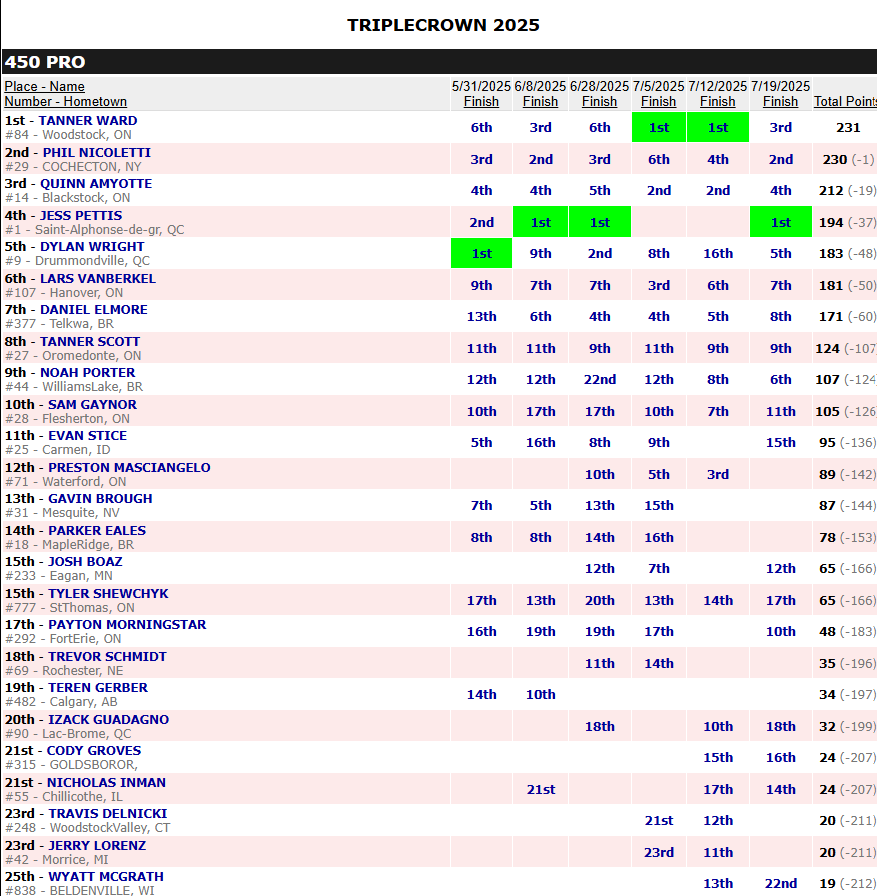 Jess Pettis wist optimaal te profiteren en schreef de wedstrijd op zijn naam. Na twee races zonder punten zette hij de knop om en reed hij naar een sterke 1-2 score, wat hem de dagzege opleverde. Phil Nicoletti wist met een 3-1 score als tweede te eindigen, gevolgd door Tanner Ward die met 4-3 beslag legde op de derde podiumplek.