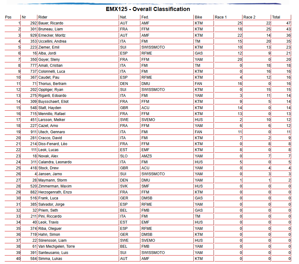 Met een 1-2 score in de manches pakte Bauer de dagoverwinning voor Bruneau (4-1) en Moritz Ernecker (2-7). Ondanks de zege van Bauer behoudt Ernecker de leiding in het kampioenschap en daarmee de rode plaat, met een voorsprong van vijf punten op zijn teamgenoot.