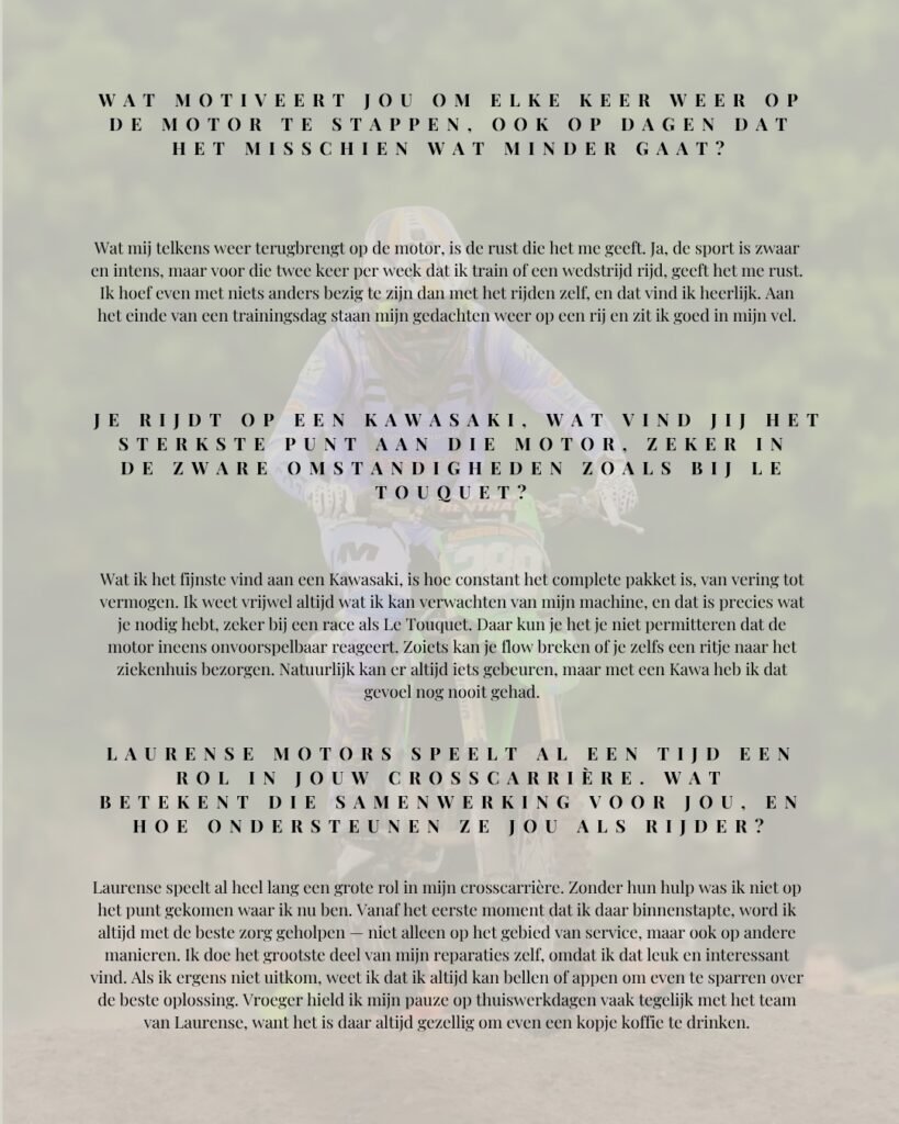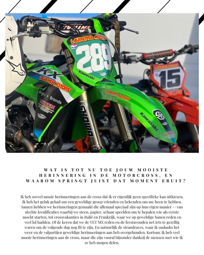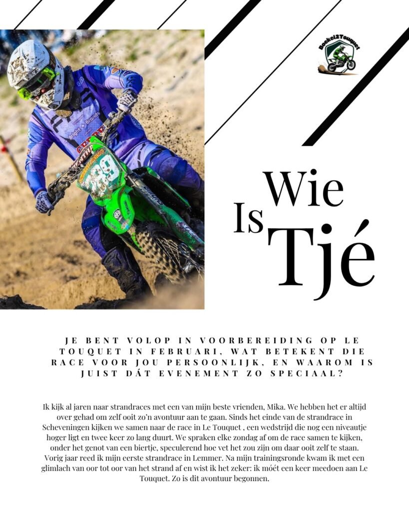 Met zijn Kawasaki en een flinke dosis passie sleutelt en traint Tjé volop richting dit iconische evenement. Zijn favoriete plek om meters te maken blijft zijn thuisbaan in Boekel, waar hij keer op keer zijn grenzen verlegt. En zijn motto? Simpel maar krachtig: “Zonder plezier geen cross.”