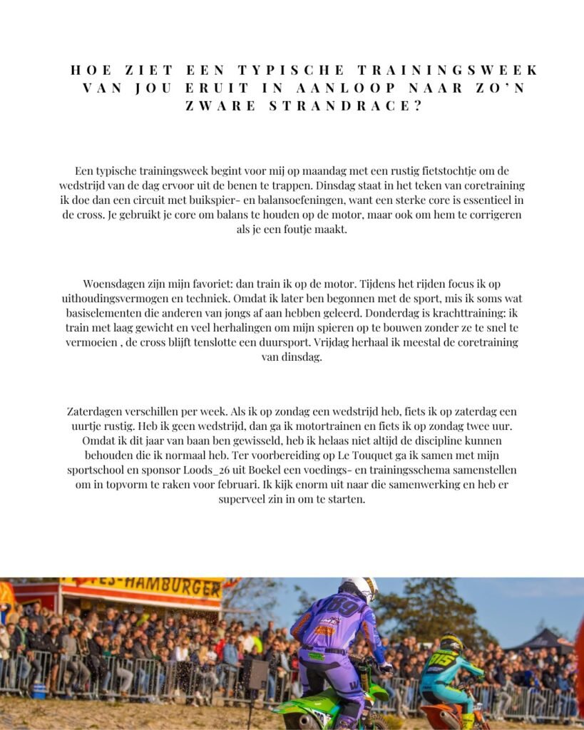 Deze maand zetten we Tjé Vonk in de spotlight! De 26-jarige crosser uit Boekel traint met volle toewijding voor zijn grootste uitdaging tot nu toe: de legendarische strandrace van Le Touquet in Frankrijk
