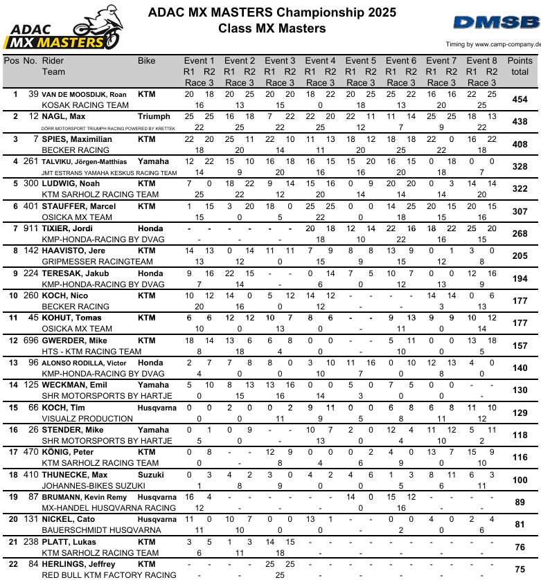 Na een zwaar 2024-seizoen is Roan van de Moosdijk dit jaar helemaal terug aan de top. Hij sluit het seizoen af met de ADAC MX Masters-titel, vóór Max Nagl die ondanks zijn sterke vorm tekortkwam in de finale. Jordi Tixier eindigde tweede in Holzgerlingen en sluit ook het kampioenschap als tweede af. Maximilian Spies pakte met zijn constante prestaties de derde plek in zowel de seizoensfinale als de eindstand.