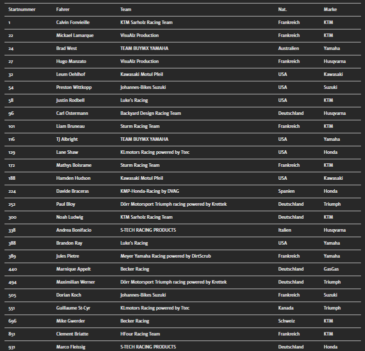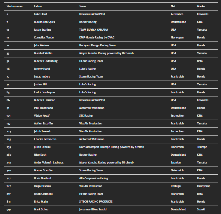 Naast Weimer verschijnen ook grote Amerikaanse namen zoals Josh Hill (Luke’s Racing, Yamaha), Mitchell Oldenburg (HFour Racing Team, Beta), Jeremy Hand (Luke’s Racing, Honda) en Mitchell Harrison (Kawasaki Team Pfeil) aan de start. Vooral Hill en Oldenburg, beiden met top-10-noteringen in de AMA Supercross en WSX, worden gezien als grote kanshebbers.