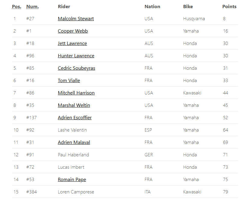 Daar nam Tom Vialle de holeshot, maar Stewart stormde door het veld en nam de leiding over na een mooie inhaalactie op Cooper Webb. Webb moest daarna alle zeilen bijzetten om Jett achter zich te houden, maar slaagde daarin. Stewart won, Webb werd tweede en Jett derde.