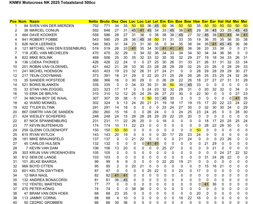 Sven van der Mierden heeft zich in Meijel voortijdig gekroond tot Nederlands kampioen in de 500cc-klasse. De ervaren rijder pakte de titel in stijl door beide manches winnend af te sluiten. Hiermee wist hij alweer zijn vierde nationale titel veilig te stellen.