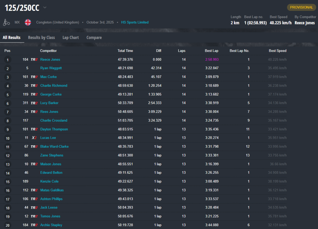 In de Youth 250-klasse ging de overwinning naar Reece Jones, die zowel de overall als de categoriezege op zijn naam schreef. Ryan Waggott pakte de winst in de 125cc-klasse, gevolgd door Charlie Richmond als tweede 125cc-rijder en Rees Jones op de derde plek. Max Corke eindigde derde algemeen en tweede in de 250’s, terwijl zijn broer George Corke met een vijfde plaats het 250-podium completeerde.