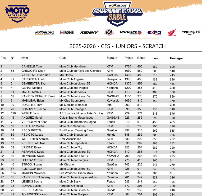 Door deze overwinning neemt Tom Caneele de leiding in het kampioenschap over van Gregoire, waarmee de spanning richting de volgende wedstrijd verder oploopt. De volgende wedstrijd wordt op 7 december verreden in St Léger de Balson.
