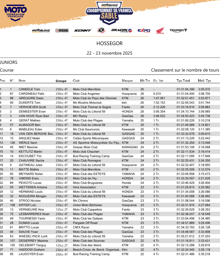 Tom Caneele heeft de Juniors klasse bij het Frans Zandkampioenschap in Hossegor op indrukwekkende wijze weten te winnen. In een zenuwslopende fotofinish wist hij nét voor Felix Cardineaux de overwinning naar zich toe te trekken. Dean Gregoire, tot vandaag leider in het klassement, werd derde. Daarachter completeerden Tom Dukerts en Scott Verhoeven de top vijf met respectievelijk een vierde en vijfde plaats.