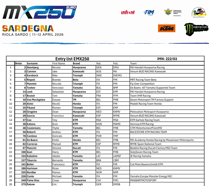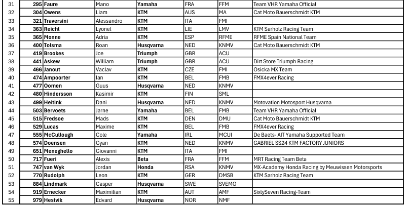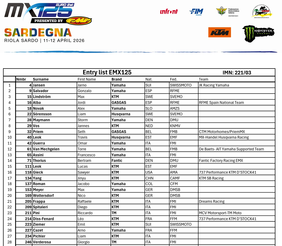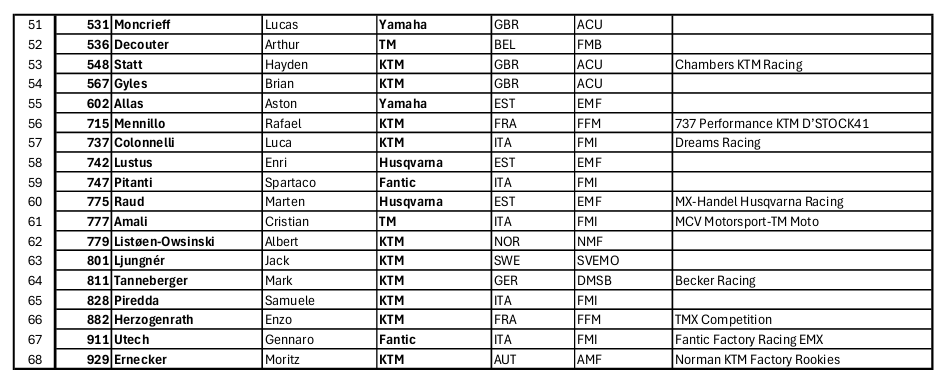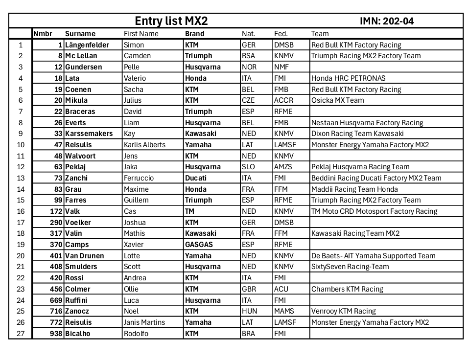 Ook in de MX2-klasse ligt de strijd open, al heeft regerend wereldkampioen Simon Längenfelder een comfortabele voorsprong van 22 punten op Guillem Farres. Opvallend is de terugkeer van Ferruccio Zanchi, die na blessureleed zijn comeback maakt en direct zijn debuut zal maken op een Ducati-machine. Ook zien we Lotte van Drunen opnieuw op de deelnemerslijst.